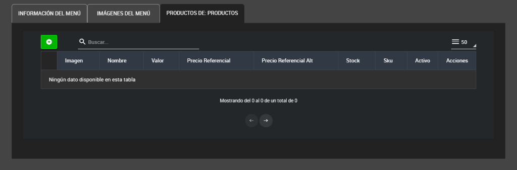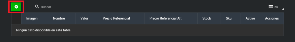 Para añadir un nuevo producto, busca y haz clic en el botón verde con el ícono de “+” que se encuentra en la esquina superior izquierda de la tabla. Al hacerlo, te dirigirás a un formulario donde podrás ingresar toda la información de tu producto.