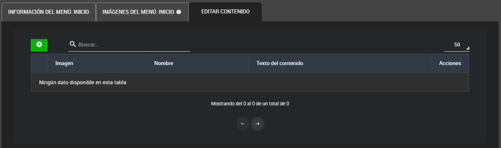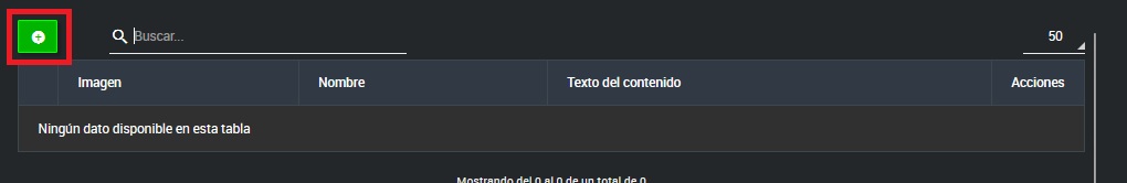 Esto te llevará a un formulario que, en la parte superior, muestra una tabla con los bloques de contenido que vayas creando. Para comenzar, puedes hacer clic en el botón verde ubicado en la esquina superior izquierda de la tabla o desplazarte hacia abajo y empezar a completar el formulario.
