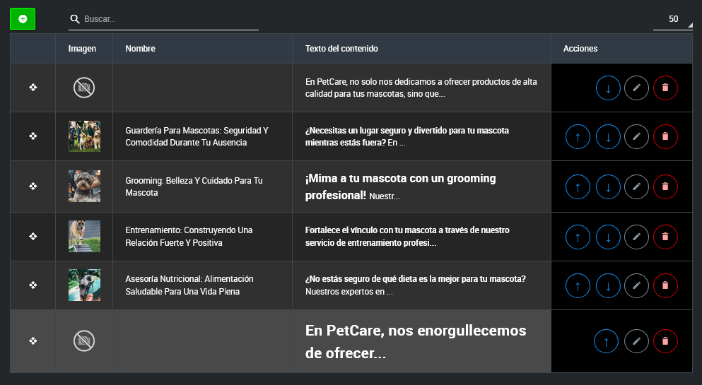 Cuando hayas completado todos los campos, guarda el bloque de contenido para que aparezca en la tabla superior. Puedes añadir tantos bloques como necesites y cambiar su orden arrastrándolos en la tabla.