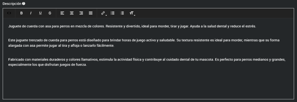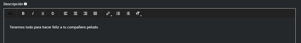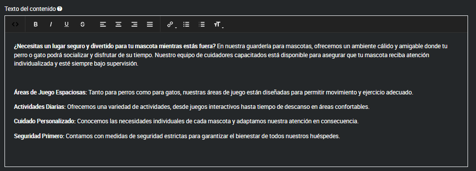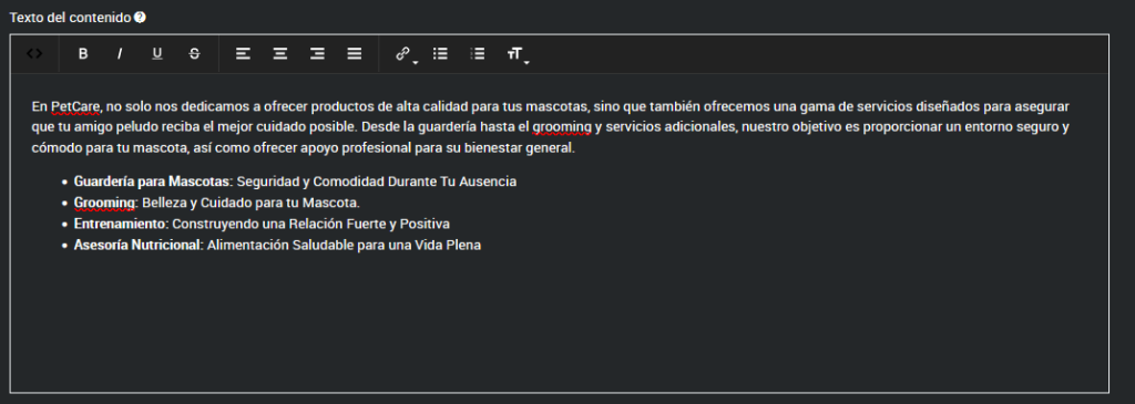 Texto del Contenido: Añade un texto claro que incluya información relevante, detalles, características o cualquier dato que quieras compartir con tus visitantes. Para ayudarte a darle el formato deseado, tienes a tu disposición una barra de herramientas que te permite editar el texto: puedes ponerlo en negrita, cursiva, subrayado, tachado, ajustar su alineación (justificado), crear listas, cambiar el tamaño de la fuente, entre otras opciones.