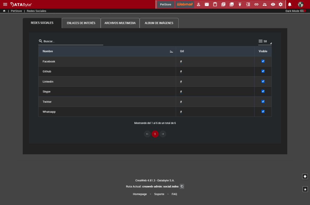 Esto te llevara a una tabla donde se mostraran las redes sociales disponibles en creaweb.