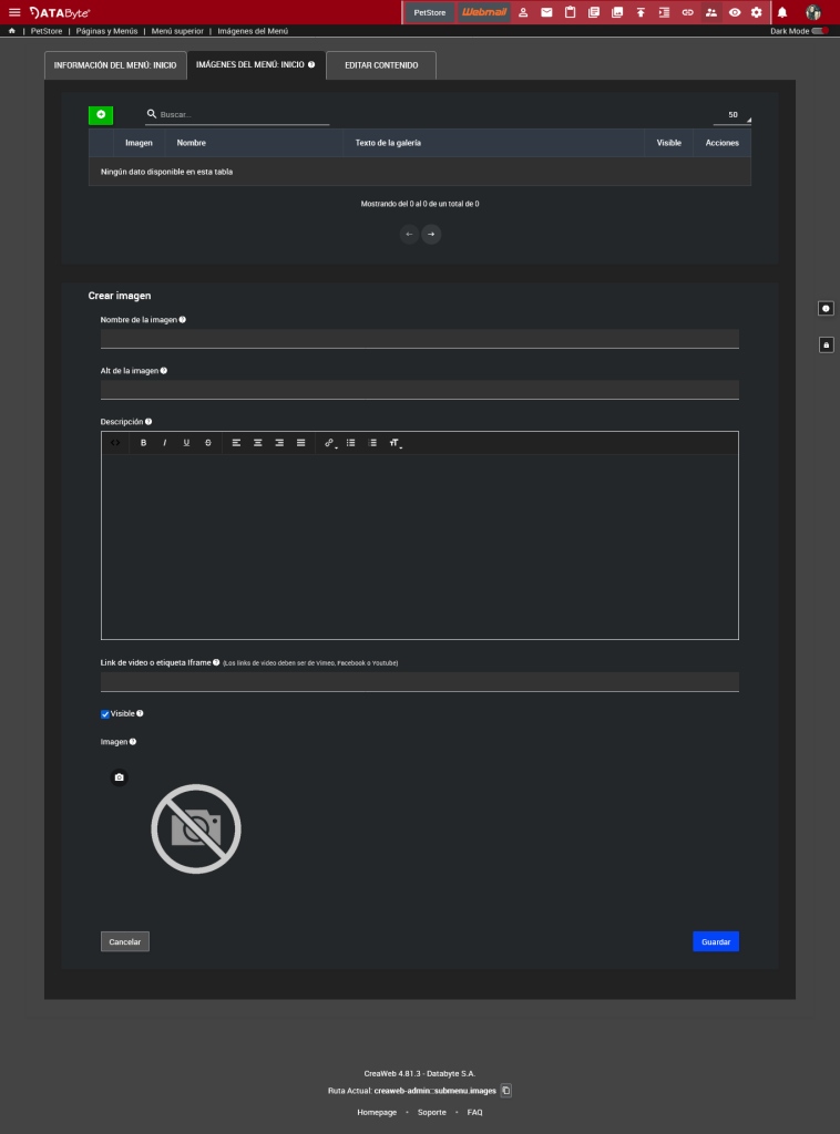 Para configurar una página de galería en Creaweb, sigue los pasos previamente explicados para añadir un nuevo menú, y luego selecciona el tipo de menú “Galería“. Esto te llevará a un formulario donde podrás añadir tus imágenes: