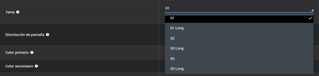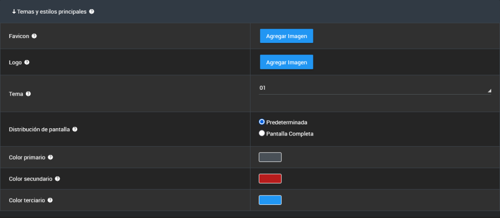- Color primario: el es el color principal aplicado a en titulos, botones, menus y otros elementos dependiendo del tema seleccionado.