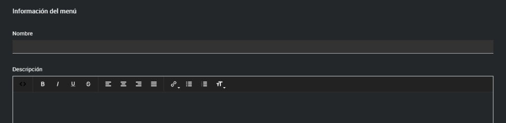 Importante: los únicos campos obligatorios son Nombre y Tipo de menú; los demás son opcionales y pueden configurarse más adelante.
