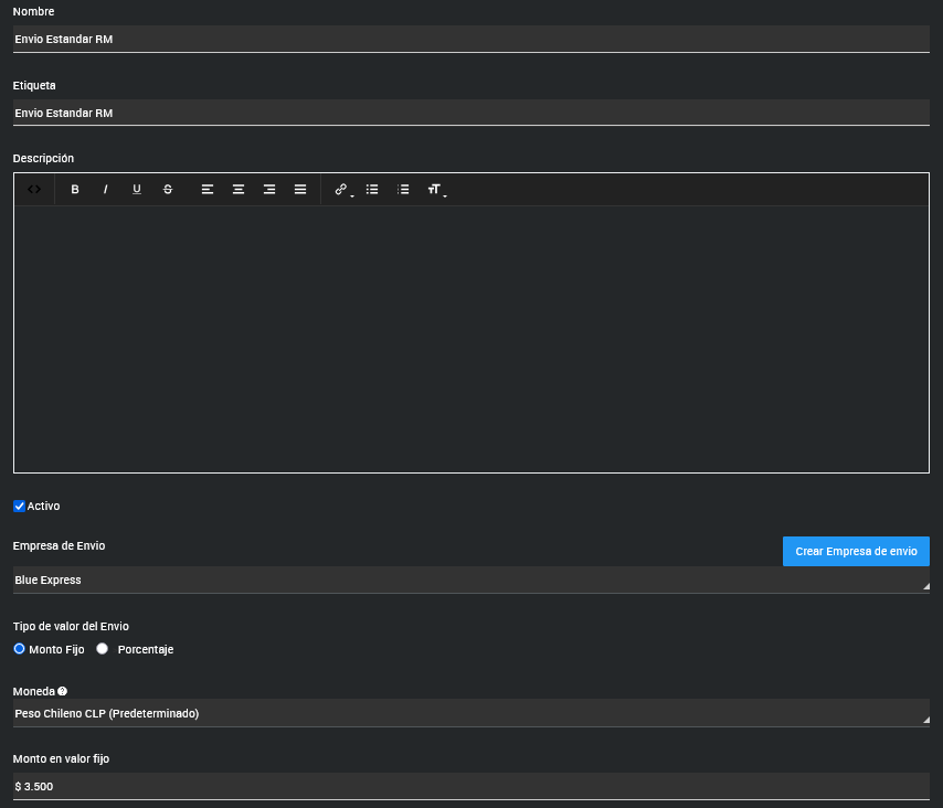 - Nombre: Asigna un nombre interno para identificar esta tarifa (Ej: “Envío Estándar RM”).